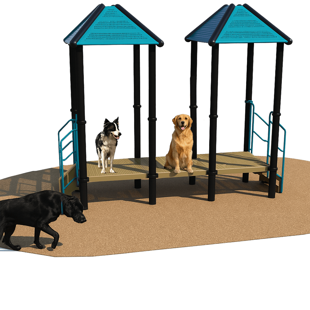 Welcome to the Café 24 — a charming, compact play structure with two covered towers and a connecting deck, ideal for fostering social interaction in a smaller footprint. Designed for community-style canine connection, this unit balances functionality with cozy style. Whether it’s a mid-day meetup or a morning romp, Café 24 serves up a delightful blend of cool shade and elevated fun in a size-conscious layout.