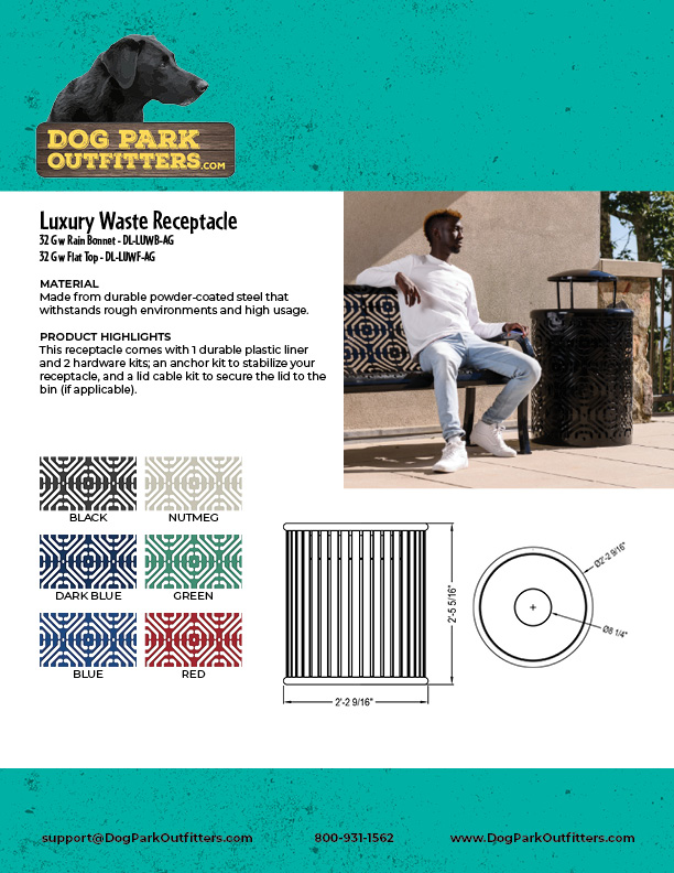 the Luxury Waste Receptacle enhances your outdoor community spaces with the perfect complement to the Luxury Bench. Designed with the same attention to quality, durability, and style, this receptacle is an essential addition to parks, dog-friendly areas, and shared outdoor spaces. Crafted from thermoplastic-coated steel, it ensures longevity and resistance to the elements, standing up to frequent use while maintaining its sleek appearance.